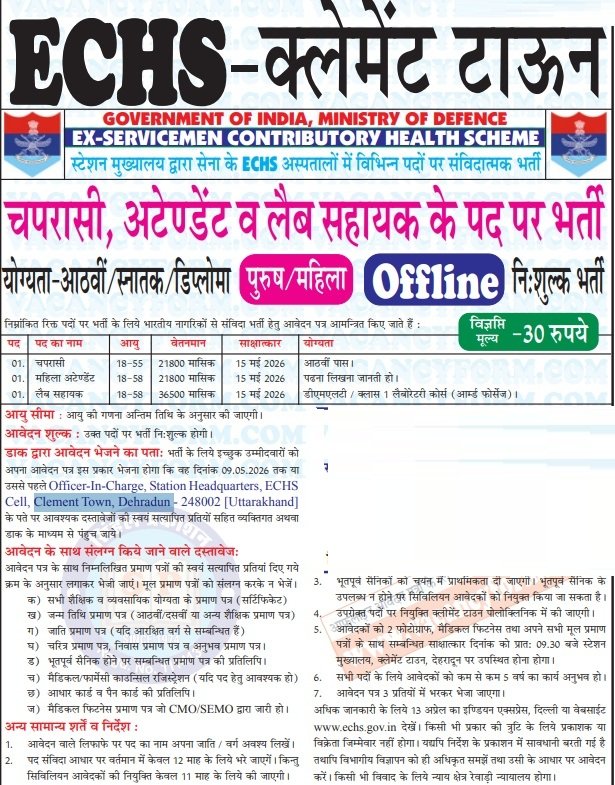 ECHS Dehradun Vacancy 2026: Ex-Servicemen Contributory Health Scheme (ECHS) Station HQ (ECHS Cell), Clement Town, Dehradun has officially released the latest recruitment notification for the posts of Peon, Female Attendant and Lab Assistant. According to the official advertisement, the application process is being conducted offline. Interested applicants can submit their completed application forms either By Post or By Hand to the specified recruitment centers before the last date. All the crucial details regarding the ECHS Dehradun Vacancy 2026, such as educational qualifications, age limits, selection procedure, and how to download the offline application form, are provided comprehensively in this post. Make sure to verify your eligibility from the official ECHS Dehradun Vacancy 2026 notification PDF before applying.