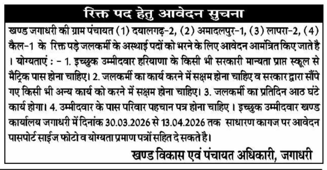 Haryana Tubewell Operator Vacancy 2026: Block Development and Panchayat Officer, District Yamuna Nagar, Haryana has officially released the latest recruitment notification for the posts Tubewell Operator. According to the official advertisement, the application process is being conducted offline. Interested applicants can submit their completed application forms By Hand to the specified recruitment centers before the last date. All the crucial details regarding the Haryana Tubewell Operator Vacancy 2026, such as educational qualifications, age limits, selection procedure, and how to download the offline application form, are provided comprehensively in this post. Make sure to verify your eligibility from the official Haryana Tubewell Operator Vacancy notification PDF before applying.