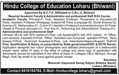 - Step 6: Finally, submit your application by hand or via post to “To, The Secretary / Principal, Hindu College of Education, Loharu, Distt. Bhiwani, Haryana – 127201.”