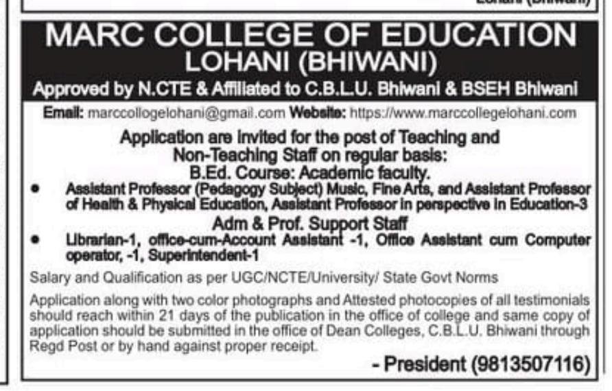 | MARC College of Education Bhiwani Vacancy 2026 Official Notice | Official Notice |