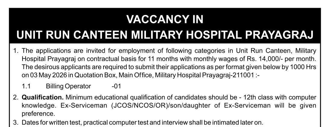 Military Hospital Prayagraj Vacancy 2026: Unit Run Canteen (URC) of the Military Hospital in Prayagraj has officially released the latest recruitment notification for the posts of Billing Clerk. According to the official advertisement, the application process is being conducted offline. Interested applicants can submit their completed application forms either By Post or By Hand to the specified recruitment centers before the last date. All the crucial details regarding the Military Hospital Prayagraj Vacancy 2026, such as educational qualifications, age limits, selection procedure, and how to download the offline application form, are provided comprehensively in this post. Make sure to verify your eligibility from the official Military Hospital Prayagraj Vacancy 2026 notification PDF before applying.