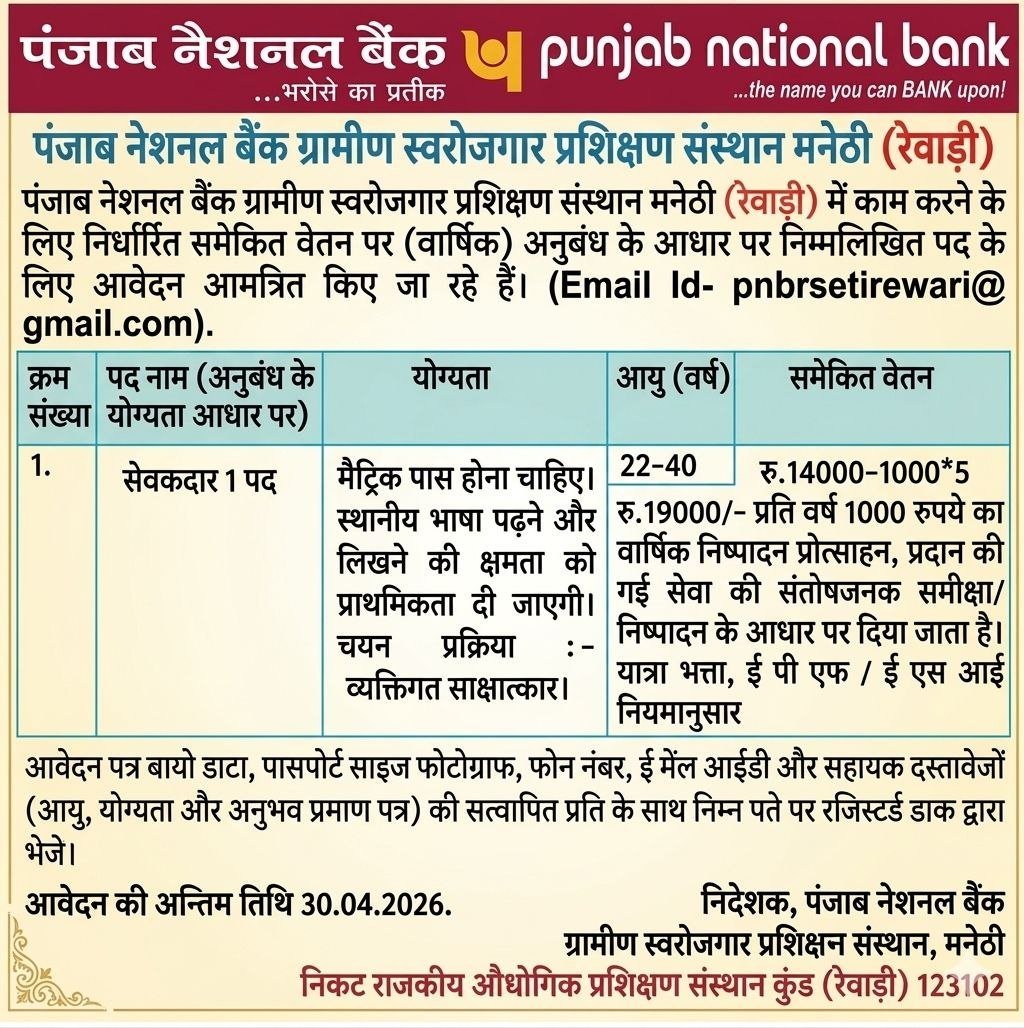 PNB Bank Rewari Vacancy 2026: Punjab National Bank, Rural Self Employment Training Institute (RSETI), Rewari has officially released the latest recruitment notification for the posts of Peon. According to the official advertisement, the application process is being conducted offline. Interested applicants can submit their completed application forms either By Post or By Hand to the specified recruitment centers before the last date. All the crucial details regarding the PNB Bank Rewari Vacancy 2026, such as educational qualifications, age limits, selection procedure, and how to download the offline application form, are provided comprehensively in this post. Make sure to verify your eligibility from the official PNB Bank Rewari Vacancy 2026 notification PDF before applying.