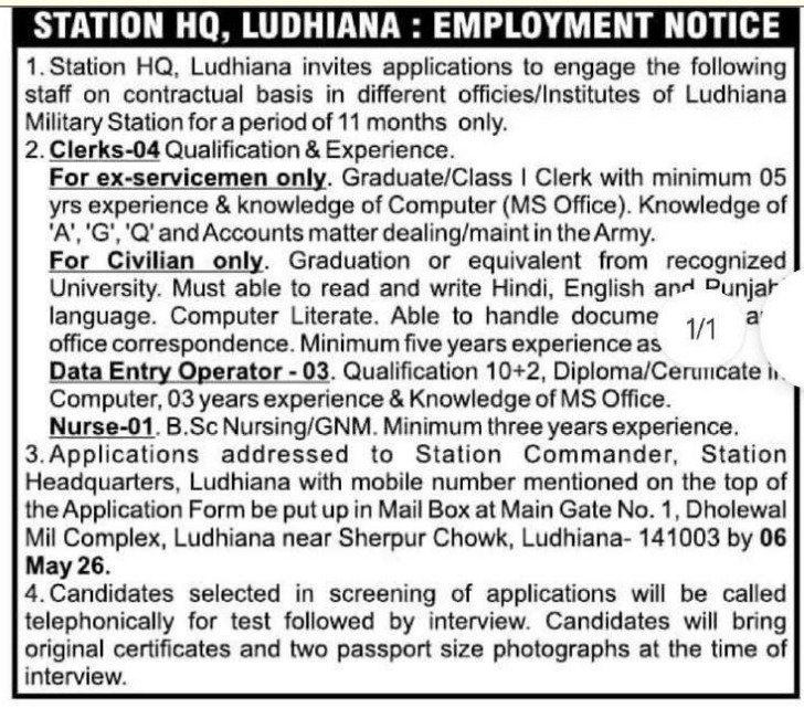 | Station Head Quarters Ludhiana Vacancy 2026 Official Notice | Official Notice |